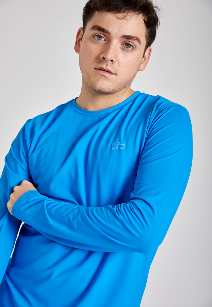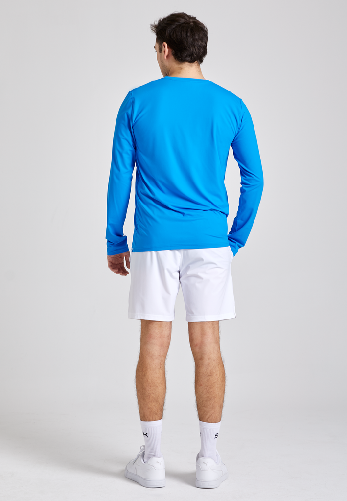 Trainiere auch an kühleren Tagen mit diesem langärmligen, cyan blauen Shirt! Gefertigt aus hochwertiger, bi-elastischer Mikrofaser garantiert das Langarmshirt maximale Bewegungsfreiheit. Federleicht liegt es auf der Haut und dank der atmungsaktiven, schnell-trocknenden Eigenschaften erfüllt es auch die funktionalen Anforderungen an ein Sportshirt der Extraklasse. Der lässige, etwas schmalere Fit mit Rundhalsausschnitt und das dezente SK Sportkind-Logo runden das aparte Erscheinungsbild des Longsleeves perfekt ab.