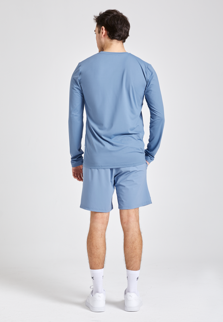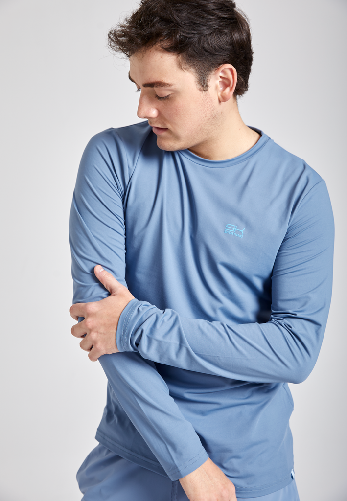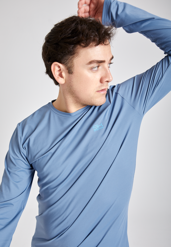 Trainiere auch an kühleren Tagen mit diesem langärmligen, grau blauen Shirt! Gefertigt aus hochwertiger, bi-elastischer Mikrofaser garantiert das Langarmshirt maximale Bewegungsfreiheit. Federleicht liegt es auf der Haut und dank der atmungsaktiven, schnell-trocknenden Eigenschaften erfüllt es auch die funktionalen Anforderungen an ein Sportshirt der Extraklasse. Der lässige, etwas schmalere Fit mit Rundhalsausschnitt und das dezente SK Sportkind-Logo runden das aparte Erscheinungsbild des Longsleeves perfekt ab.