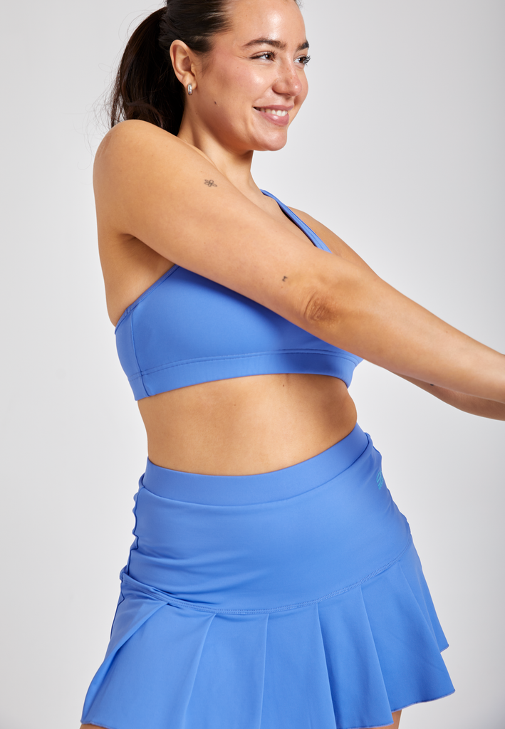 Der raffiniert geschnittene, kornblumen blaue Faltenrock bietet die perfekte Kombination aus schickem Design und absoluter Funktionalität. Sitz und Halt des Tennis Skorts werden auch in bewegungsintensiven Spielsituationen durch den breiten, elastischen Hüftbund und die integrierte Shorts garantiert. Zugleich erhöht das hochwertige, atmungsaktive und schnell trocknende Stretchmaterial des Tennisrocks mit angesetzten Falten den Tragekomfort und sorgt für eine größtmögliche Bewegungsfreiheit. Mit einem UV-Schutz 50+ ist man zudem auch an sonnigen Tagen bestens ausgestattet.